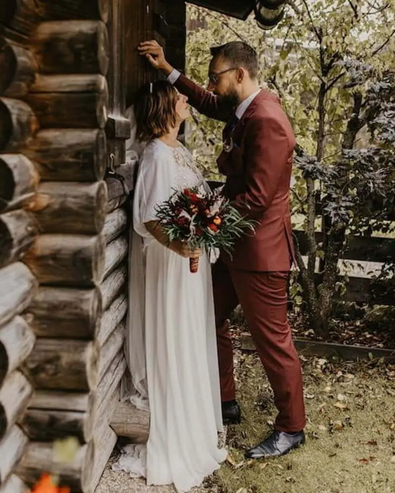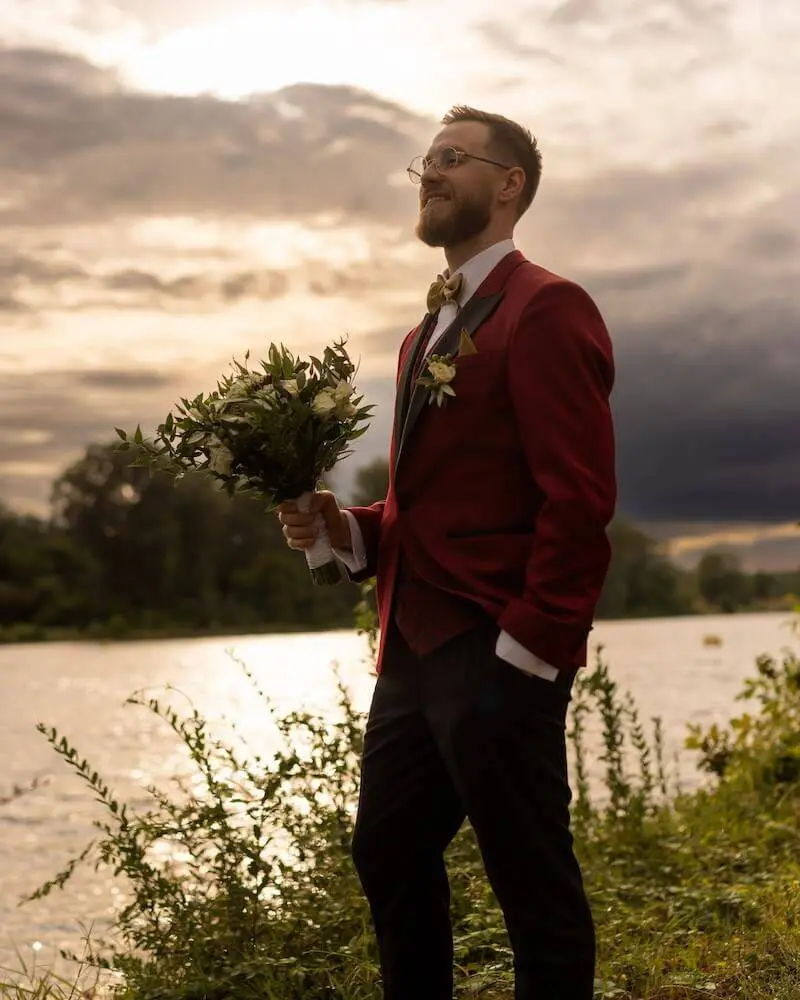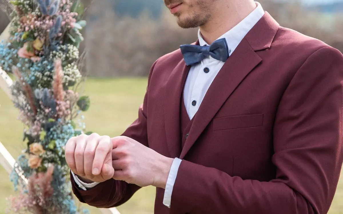 Typischerweise werden hierfür gerne Bordeauxrot, Weinrot oder auch ein dunkles Ziegelrot als Anzugstoff gewählt. Rote Anzüge sind ideal für Herbsthochzeiten oder elegante Hochzeiten, die vorwiegend am Abend stattfinden.