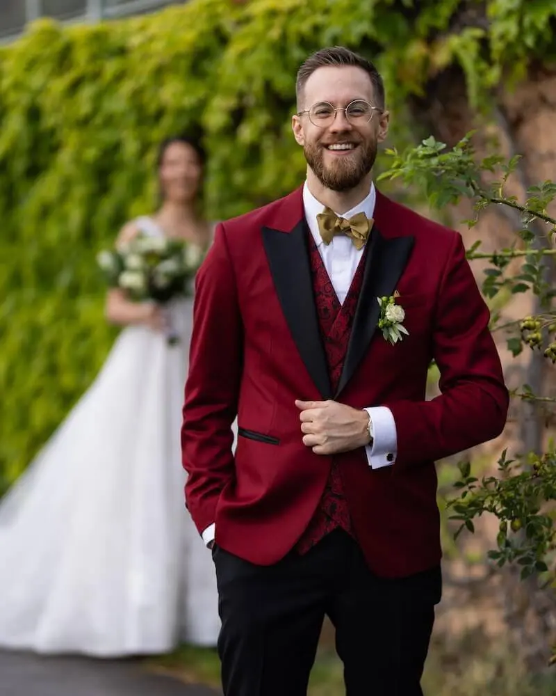 Wer zu seiner Hochzeit ein modisches Statement setzen will und den Anzug auch später als eleganten (aber nicht langweiligen) Anzug tragen will, trifft mit Rot eine wirklich gute Wahl.