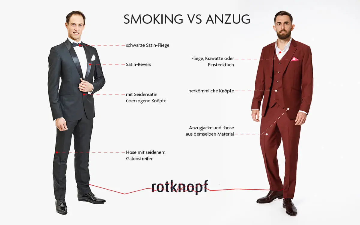 Der Smoking ist dabei meist schwarz und durch sein charakteristisches Seiden-Revers gekennzeichnet. Er steht für festliche Abendveranstaltungen mit strengen Dresscodes, während der Anzug vielseitig einsetzbar ist, von Business über Feiern bis hin zu Freizeit. Ein Anzug kann auch in bunten Farben gefertigt und mit Accessoires wie Krawatten oder Fliegen kombiniert werden.